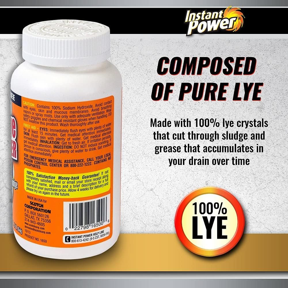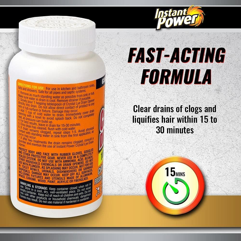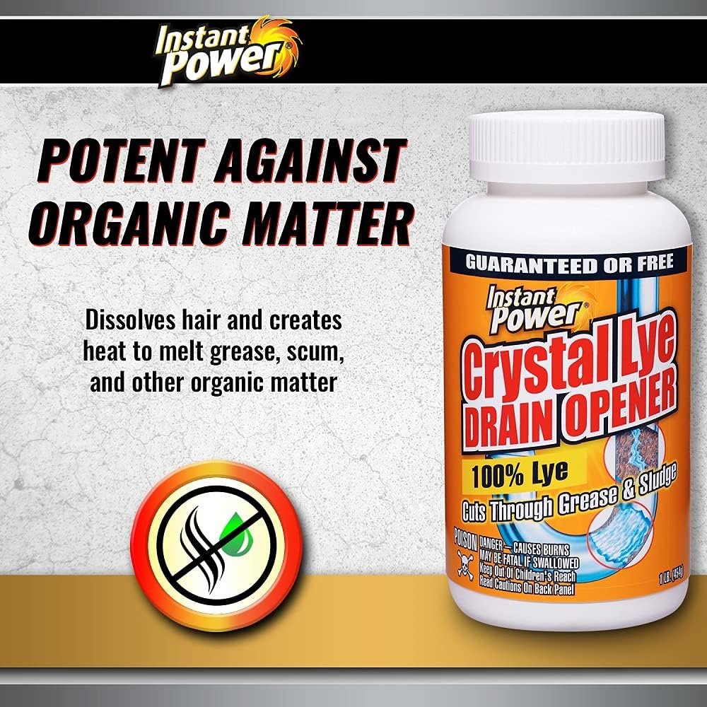 Instant Power Crystal Lye Drain Opener from the Instant Power Store is a professional-strength solution designed to rapidly unclog bathroom and kitchen sinks, drains, and shower pipes. Featuring a powerful 100% lye (sodium hydroxide) formula, it dissolves hair, soap scum, grease, and other stubborn blockages in as little as 15-30 minutes, all while remaining safe for pipes and septic systems. Easy-to-follow instructions make tough clogs easy to tackle, making this a must-have for anyone seeking a quick and reliable drain cleaning solution.